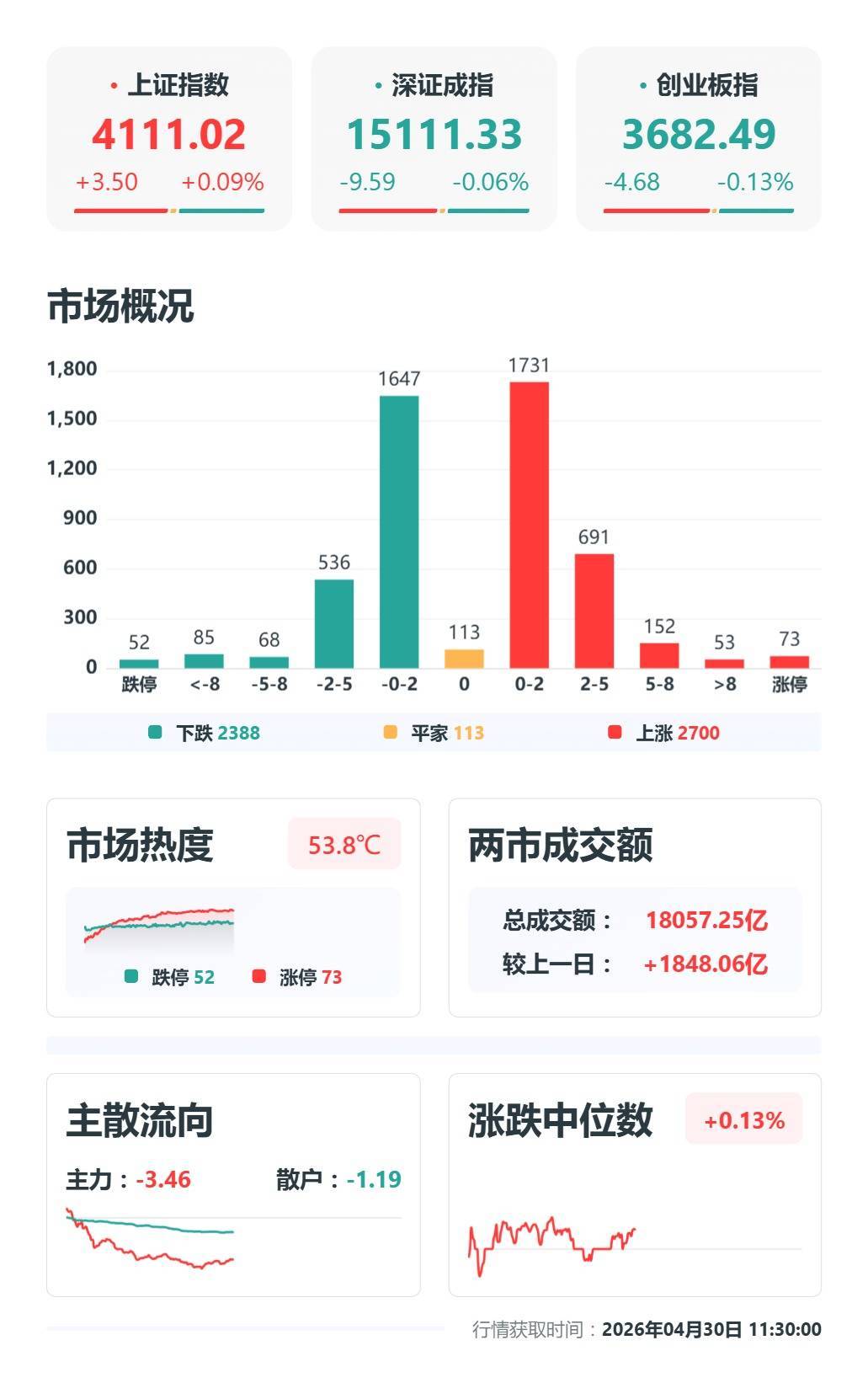 截至午间收盘,沪指涨0.09%,报4111.02点,深成指跌0.06%,报15111.33点,创业板指跌0.13%,报3682.49点,科创50指数涨4.71%,报1563.86点。沪深两市合计成交额18057.25亿元,较上个交易日同一时段放量1848.06亿元。
