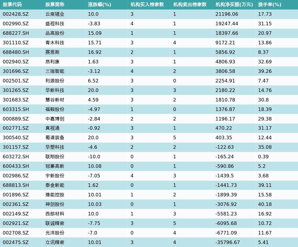 南财智讯4月20日电,盘后数据显示,因当日异动登上龙虎榜的个股中配资门户网站,25只沪深A股龙虎榜出现了机构的身影,机构合计净买入29195.38万元,具体来看,机构净买入14只个股,净卖出11只个股。其中,机构净买入前三分别为云南锗业(002428.SZ)、盛视科技(002990.SZ)与品高股份(688227.SH),详情见下图:机构净卖出的个股中,前三分别为立讯精密(002475.SZ)、光洋股份(002708.SZ)与联诚精密(002921.SZ)。