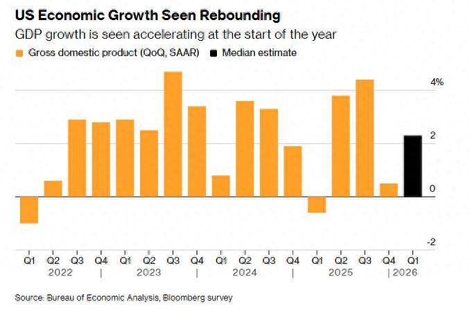 2025年底联邦政府创下史上最长停摆纪录后,政府支出大幅反弹,或将推高整体GDP数据;预测人士认为,若战事持续,国防支出增加将为经济增长提供支撑。同时,企业投资数据可能反映出人工智能(AI)建设相关支出持续火热的态势。
