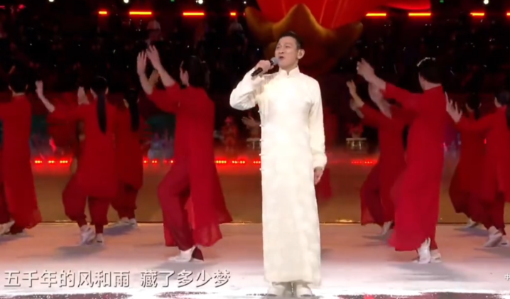 他身穿白色唐装,站在舞台中央,以一首《中国人》唱出了永不褪色的家国情怀。这首为庆祝1997年香港回归而创作的歌曲,旋律运用了中华民族特有的六声羽调式音调,填词采用一字一音,使得表达格外铿锵有力。