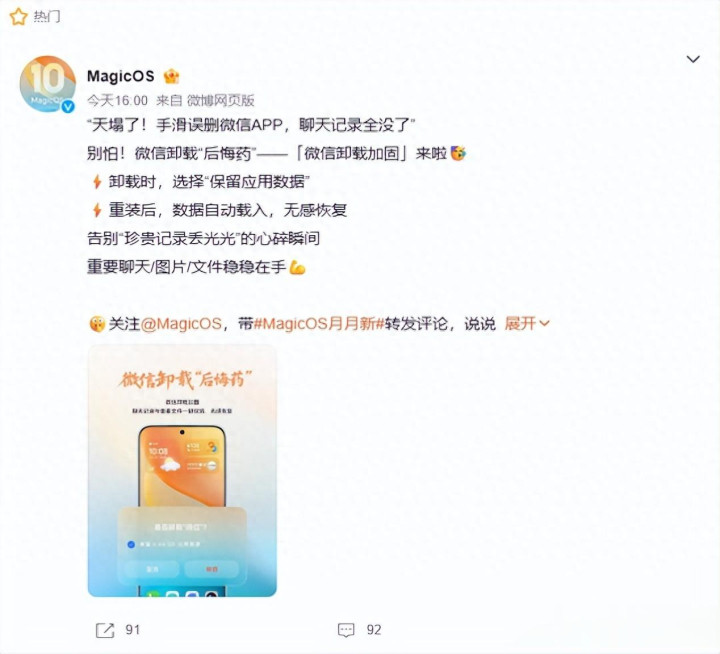 该功能被称为,微信卸载“后悔药”,目前只支持MagicOS 10.0.116以上版本,并且仅支持微信主账号,不包括微信分身。